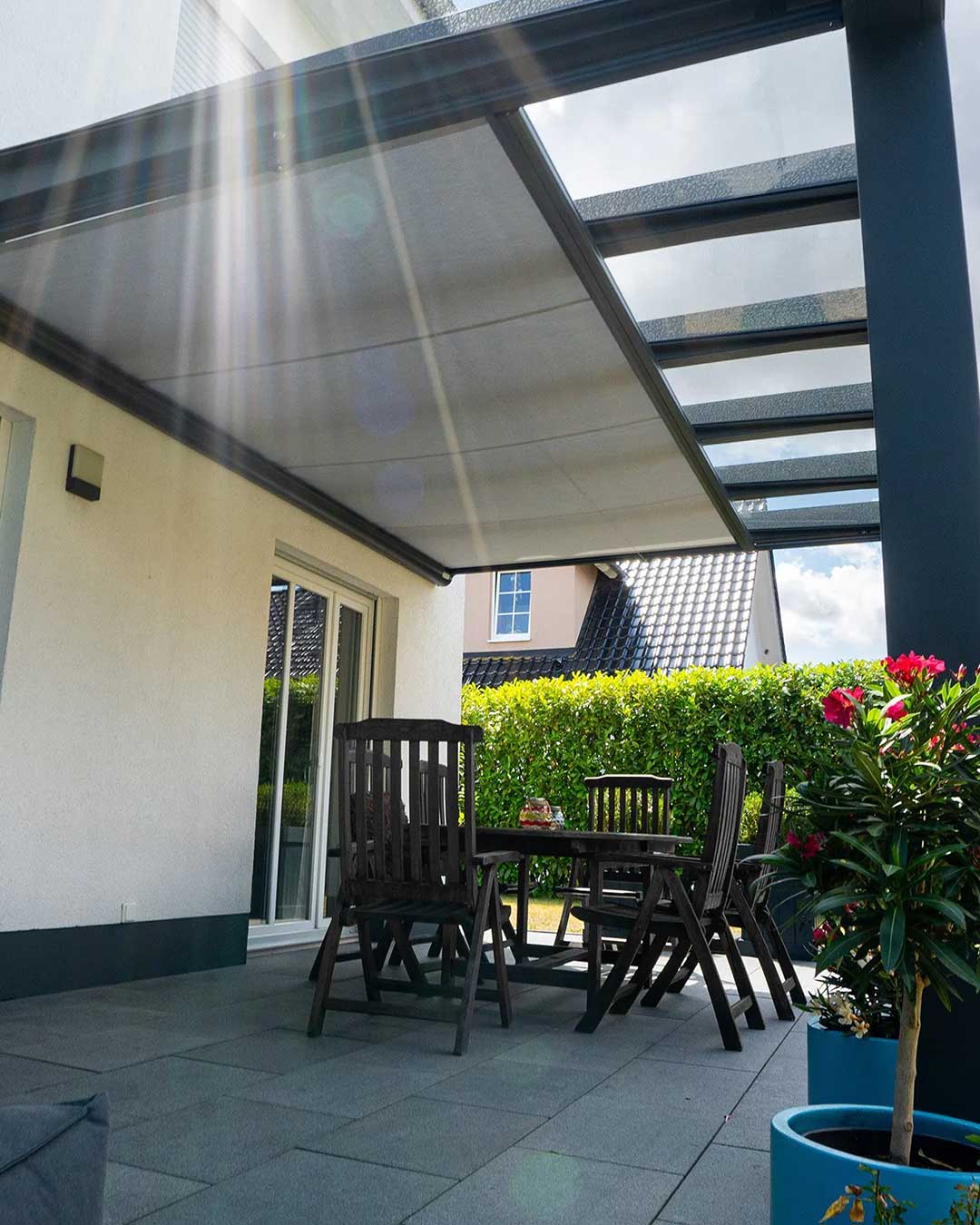 Eine Unterdachbeschattung mit hochwertigem Spannsystem. Durch seitliche Reißverschluss-ZIP Tuchführung wird das Tuch zusätzlich noch an allen vier Seiten gespannt. So haben Sie optisch und technisch ein sehr hochwertiges Gesamtprodukt unterhalb Ihrer Terrassenüberdachung.
